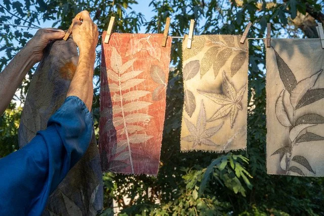 Eco-printing is an art form that brings the unique and varied beauty of Nature into a creative process. It entails gathering suitable leaves, bark, flowers, and even food such as onion skins, and placing them on fabric. The fabric is then rolled into a bundle around a tube, pipe, or dowel, tied, and placed in either water or steam.